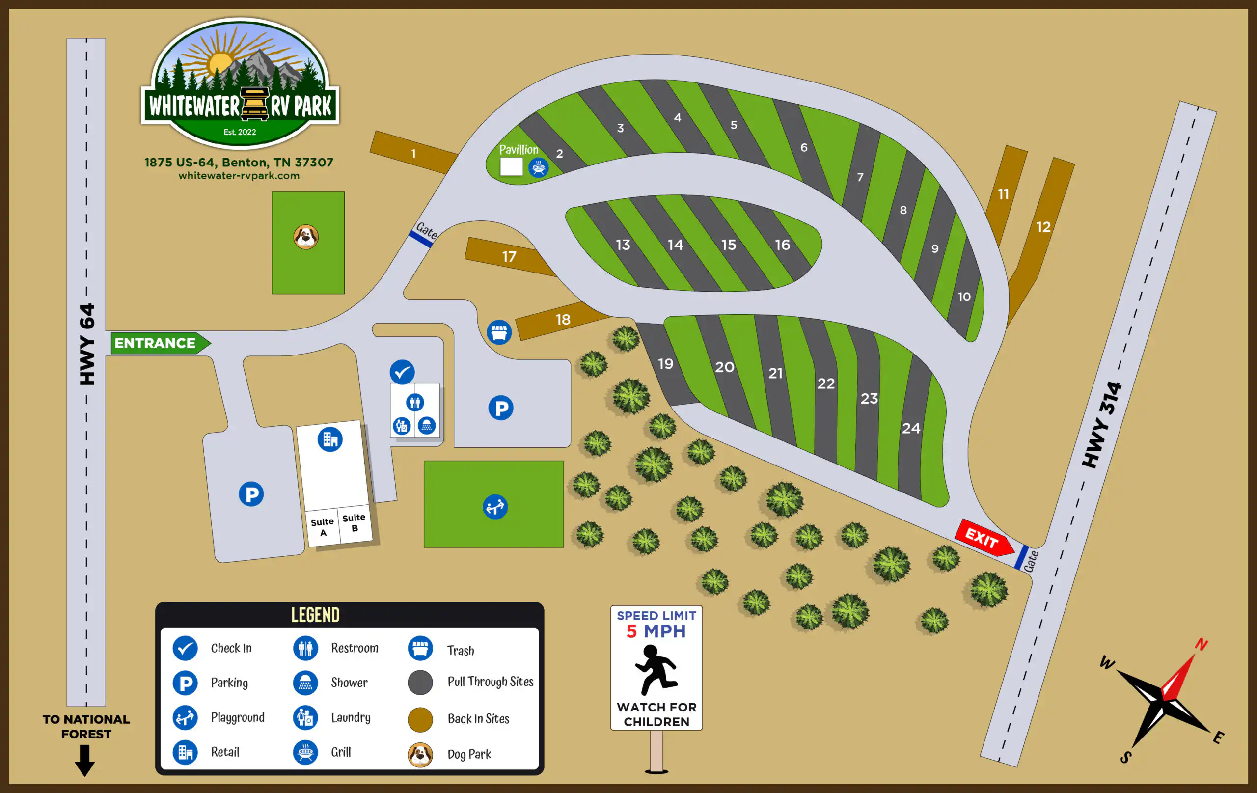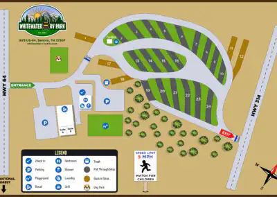 RV PARK MAP & GALLERY For all inquiries, please call us at (423) 464-7948 or email office@whitewater-rvpark.com. Below is a RV Spot Map of the Property: BOOK YOUR RV SPOT BOOK WHITEWATER RAFTING TOUR RV PARK GALLERY